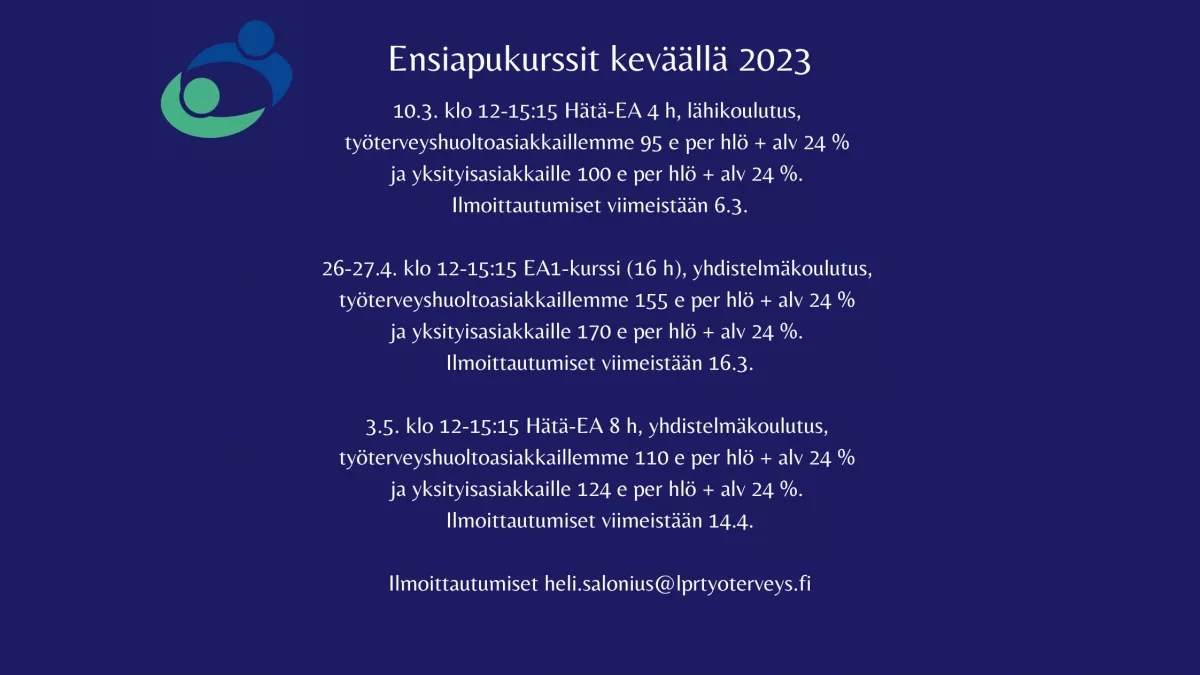 Kouluttajana työterveyshoitaja / ensiavun ja terveystiedon kouluttaja ETK Heli Salonius. Ilmoittautumiset Helille sähköpostitse heli.salonius [at] lprtyoterveys.fi. Yhdistelmäkoulutusta ei voi peruuttaa sen jälkeen, kun on saanut verkkoosuuden suoritettavaksi. Lähikoulutuksen peruutukset vähintään 2 vrk ennen kurssia tai laskutamme kurssin hinnan.