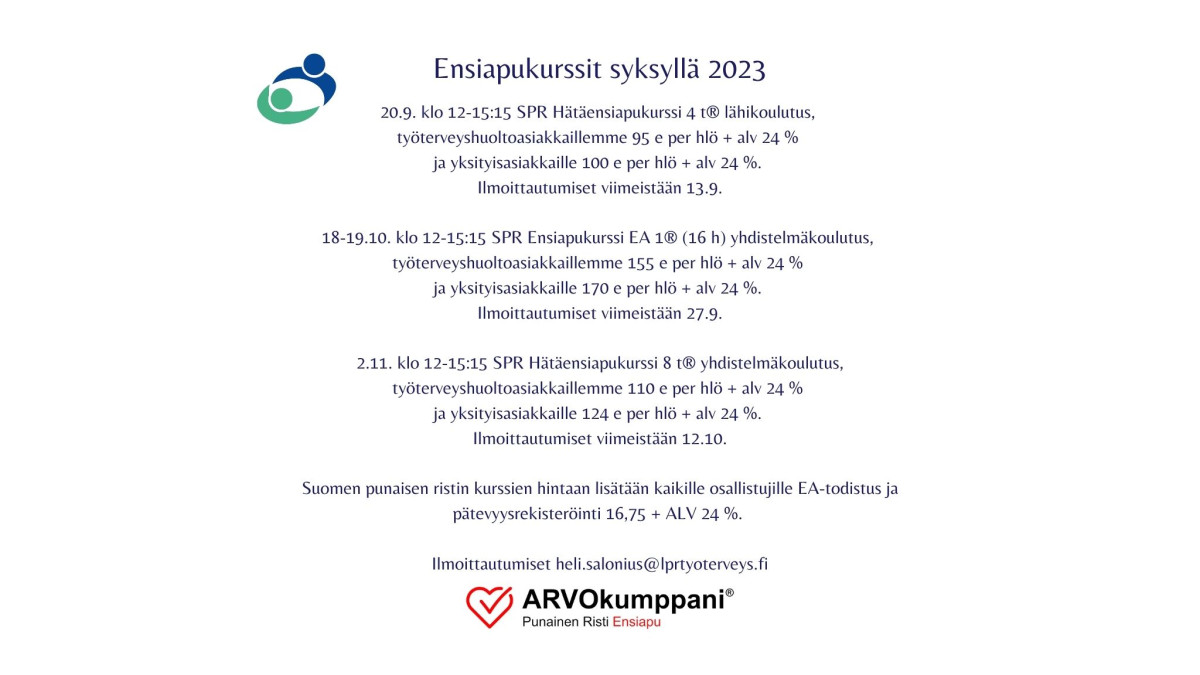 Kouluttajana työterveyshoitaja / ensiavun ja terveystiedon kouluttaja ETK Heli Salonius. Ilmoittautumiset Helille sähköpostitse heli.salonius [at] lprtyoterveys.fi. Yhdistelmäkoulutusta ei voi peruuttaa sen jälkeen, kun on saanut verkko-osuuden suoritettavaksi. Lähikoulutuksen peruutukset vähintään 2 vrk ennen kurssia tai laskutamme kurssin hinnan.