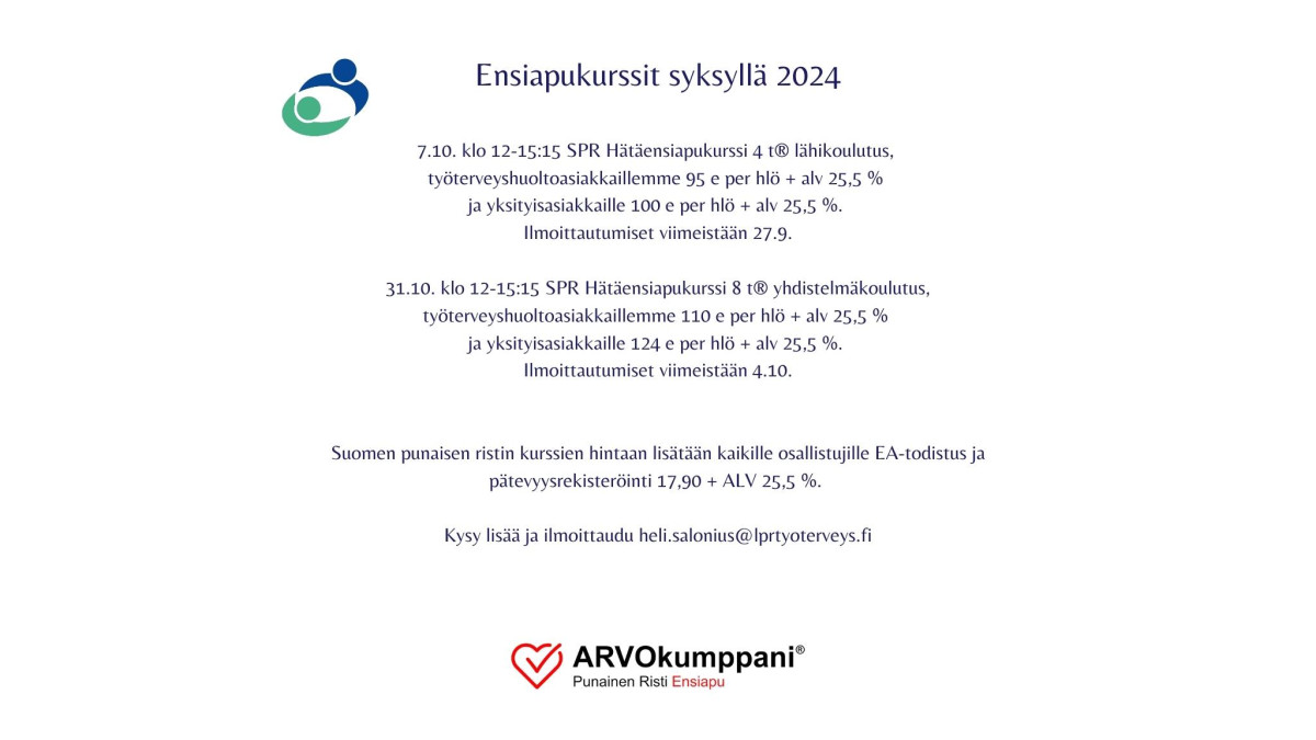 Kouluttajana työterveyshoitaja / ensiavun ja terveystiedon kouluttaja ETK Heli Salonius. Ilmoittautumiset Helille sähköpostitse heli.salonius [at] lprtyoterveys.fi. Yhdistelmäkoulutusta ei voi peruuttaa sen jälkeen, kun on saanut verkko-osuuden suoritettavaksi. Lähikoulutuksen peruutukset vähintään 2 vrk ennen kurssia tai laskutamme kurssin hinnan.
