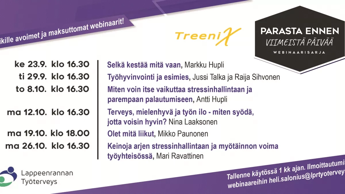 Webinaarit Webinaarit Arkisto 2025 Ilmoittaudu syksyn ensiapukursseille Työfysioterapia – tuki ja apu työhyvinvointiin Mitä syödä, että jaksat ja pysyt terveenä? Toistuva väsymys voi kertoa uniapneasta – yöpolygrafia tutkii unen laatua helposti kotona Työkykykoordinointi tukee henkilöstöä ja työyhteisöä muutoksissa ja arjessa EKG:n pitkäaikaisrekisteröinti eli Holter-tutkimus Mitä asiakkuus meille merkitsee Tunnista hyönteisten puremat ja pistot ja hoida ne oikein Palovammojen ensiapu ja hoito Punkin pureman tunnistus ja hoito Neljä vuosikymmentä työterveyden etulinjassa 50 vuotta paikallista työterveyttä Etelä-Karjalassa! Pidä siitepölyallergian oireet kurissa 2024 Ensiapukurssit syksyllä 2024 2023 Ensiapukurssit syksyllä 2023 Ensiapukurssit keväällä 2023 2022 Asiakastiedote 21.12.2022 Lappeenrannan työterveydeltä vinkit pukinkonttiin! 🎁 Syksyn 2022 ensiapukurssit Tartuntatautipäiväraha 2021 Mobiilisovellus Late 8.4.2021 Asiakastiedote 25.3.2021 2020 Asiakastiedote 1.12.2020 Asiakastiedote 29.9.2020 Tervetuloa Laboratorio-käynnille Webinaarit Asiakastiedote 18.6.2020 Asiakastiedote 25.5.2020 Asiakastiedote 2.4.2020 Koronavirus oirearvio Ohje yrityksille koronavirustartuntojen ennaltaehkäisemiseksi Pidä ensiaputaitoja yllä 2019 Tiedote 25.9.2019 Aukioloajoistamme Kelan korvausjärjestelmän muutos Siitepölyallergikot huomio! 2018 Jäsentiedote 20.12.2018 Jäsentiedote 8.10.2018 Tiedote 17.10.2018 Jäsentiedote 3.9.2018 Hallituksen päätös Jäsentiedote 7.5.2018 Kesän lähestyessä on hyvä hetki miettiä hieman rokote asioita! Jäsentiedote I/2018 Nettiajanvaraus 5.3.2018 alkaen Ilmoita sairauslomat ja työtapaturmat